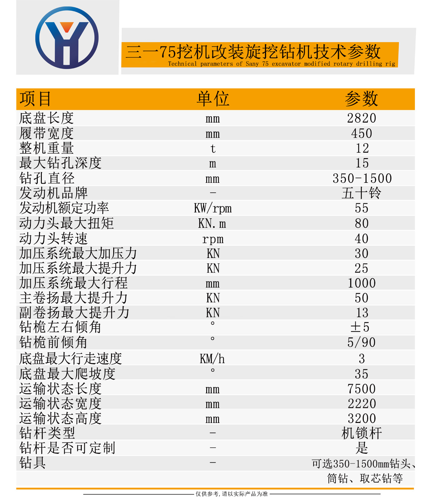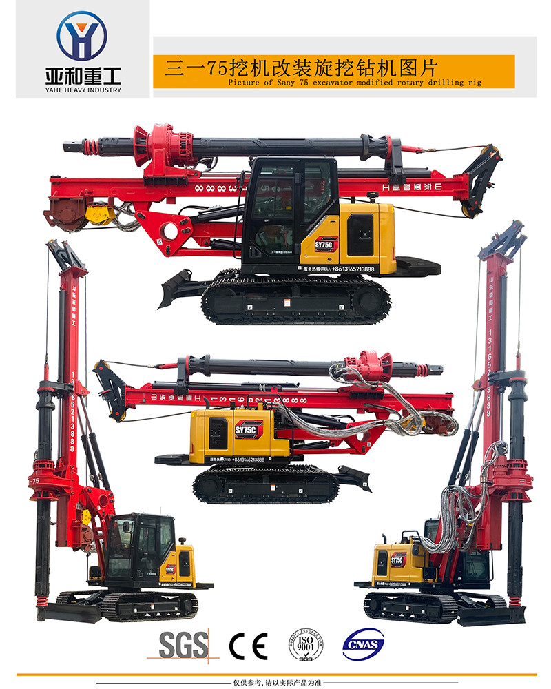采用三一SR75挖机做平台改装为小型旋挖钻机。采用进口五十铃发动机,钻孔深度15m,孔径350-1500mm,整体重量12t,体积小巧,方面运输转场,尤适用于低窄小空间施工使用。