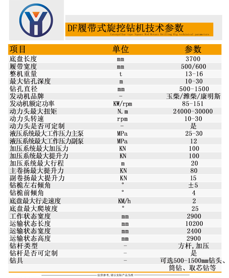 整机重量:13-16t 钻孔深度:5-30m 钻孔直径:500-1500mm