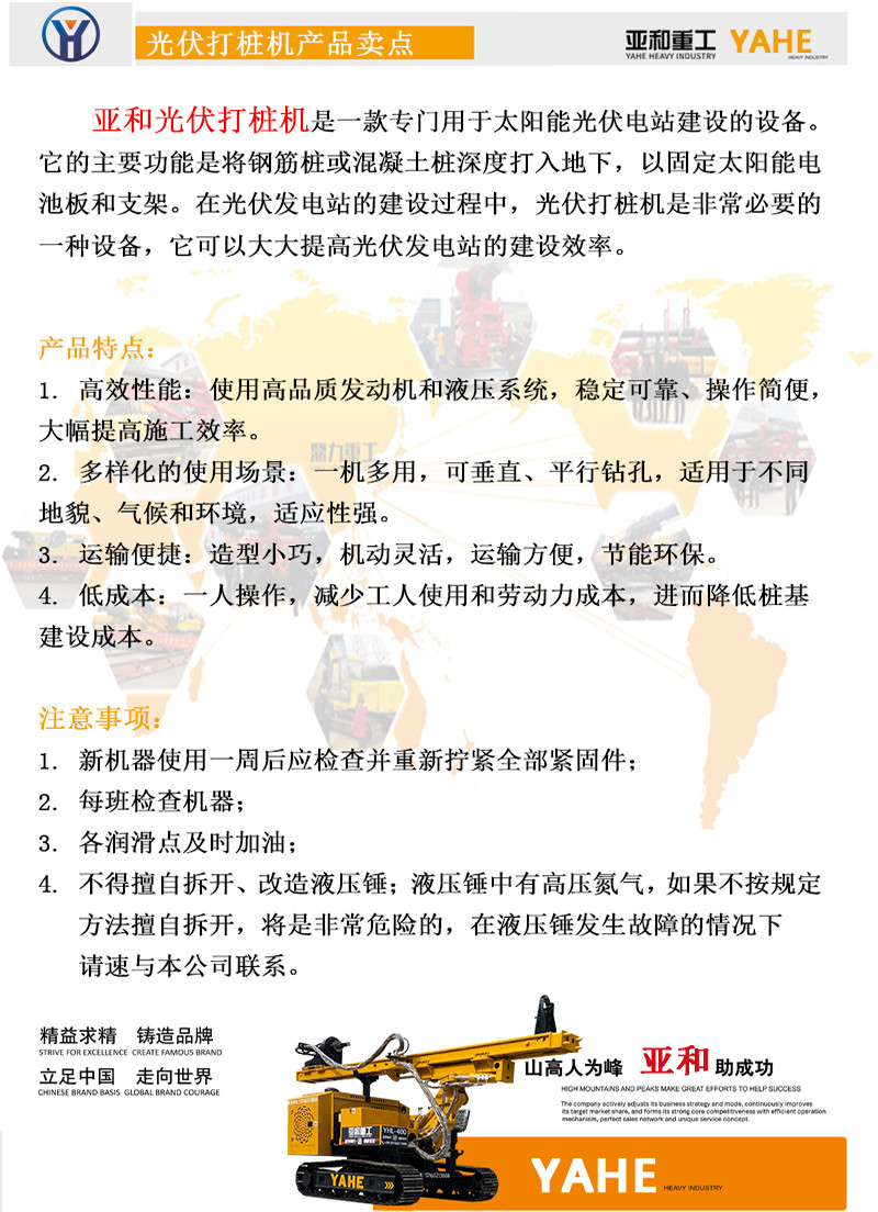 亚和光伏打桩机是一款专门用于太阳能光伏电站建设的设备。它的主要功能是将钢筋桩或混凝土桩深度打入地下,以固定太阳能电池板和支架。在光伏发电站的建设过程中,光伏打桩机是非常必要的一种设备,它可以大大提高光